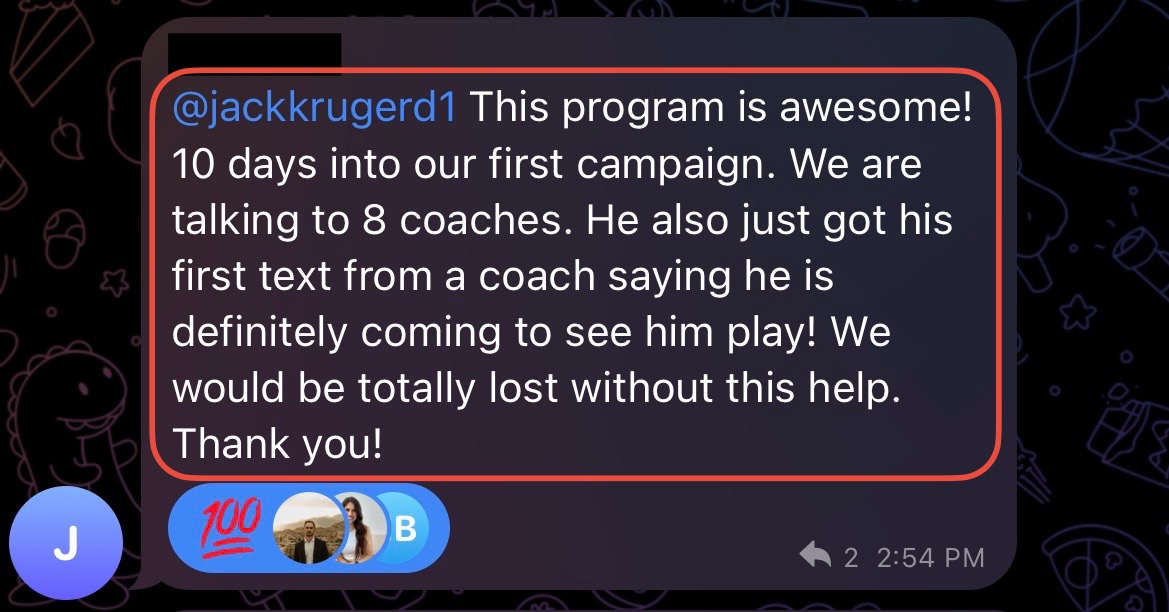 If you complete all 12 weeks, submit every assignment, and execute the outreach plan (minimum 50+ schools contacted), and you don't receive at least 5 coach signs of interest (responses, follows, or phone calls), we'll give you complimentary access to another 12-Week Academy enrollment ($2800 value) to ensure your success.