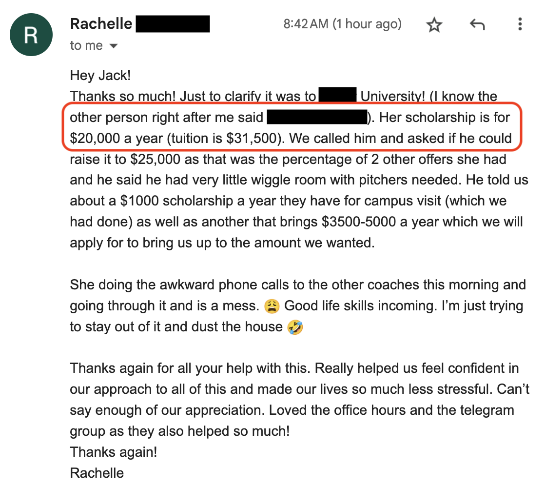 These calls are designed for you to get personalized advice that is tailored to your specific situation. Leverage the experience of our faculty and ensure that you're always putting your athlete's best foot forward to maximize scholarship offers and money.